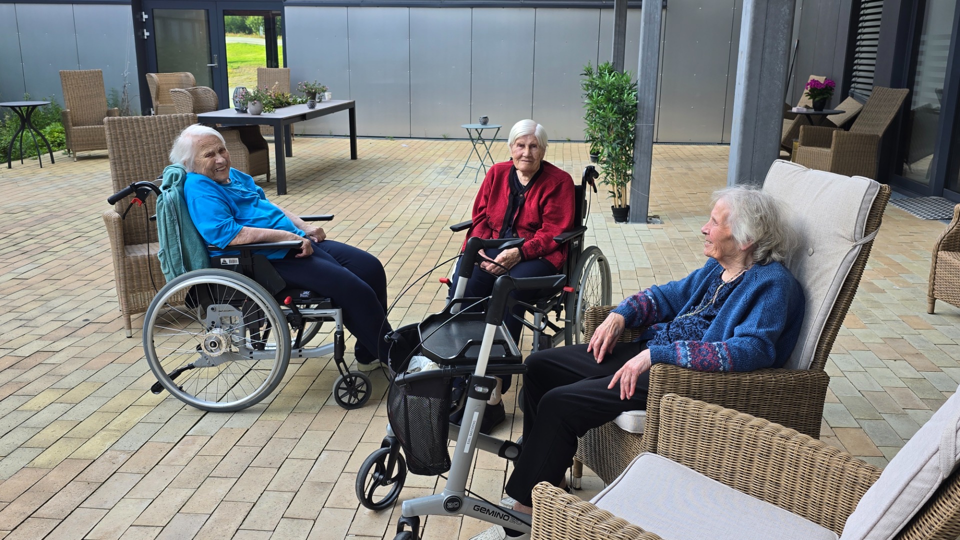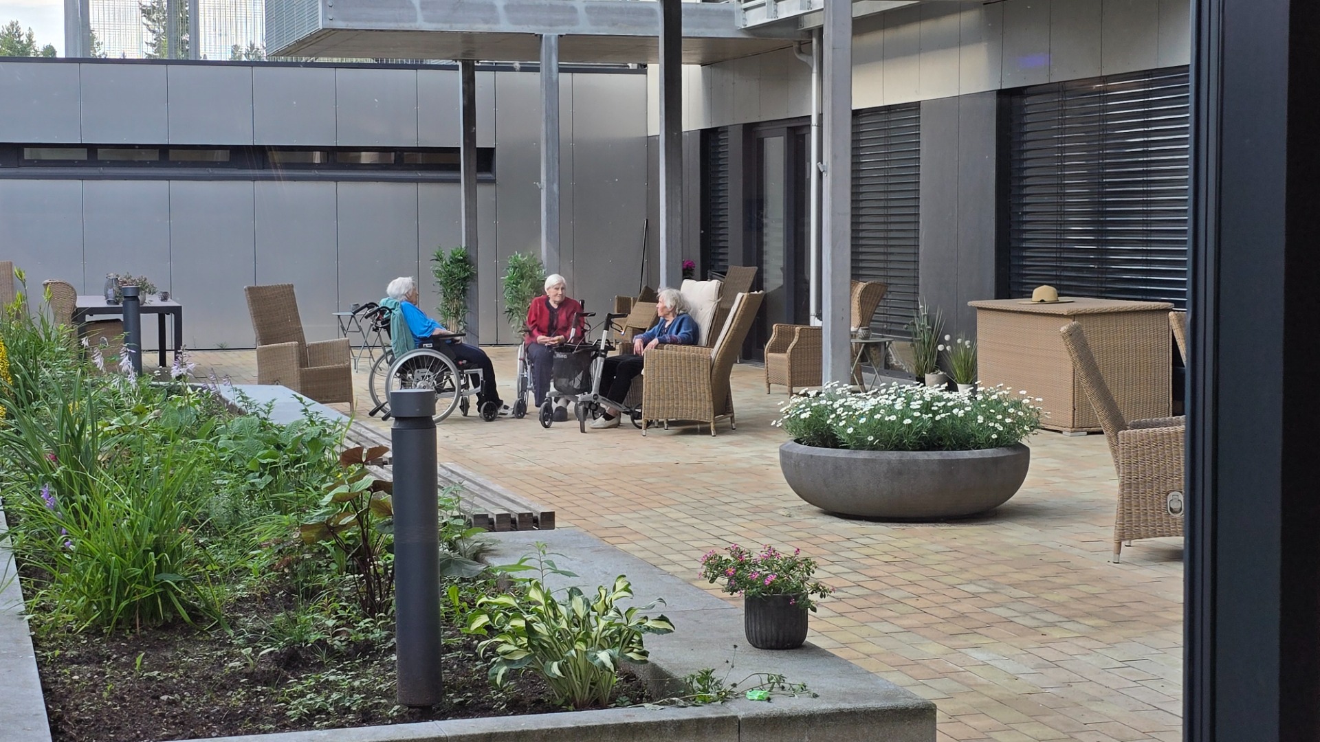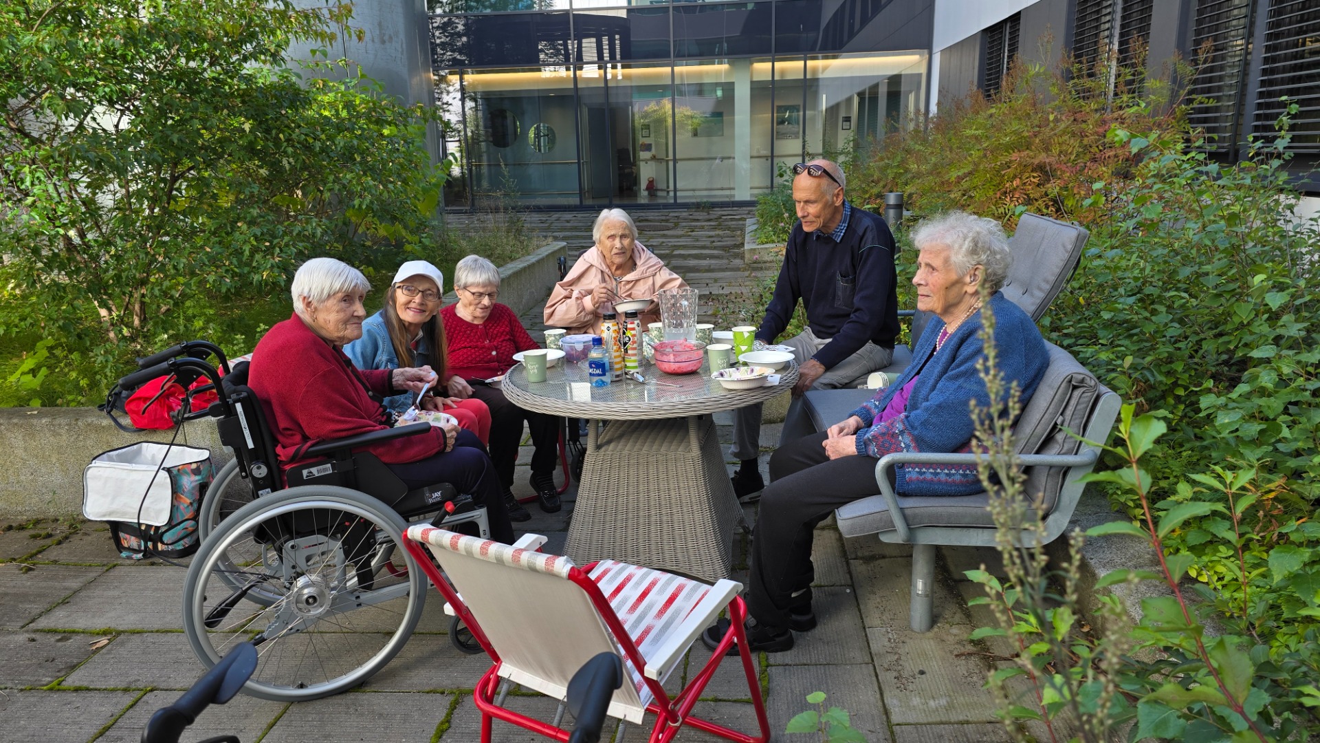En samling utendørs i en av hagene inne på selve Helsehuset i 1 etasje. En hage som er god å ha om sommeren. En hage min mor liker seg veldig godt, og som ligger rett utenfor hennes rom.