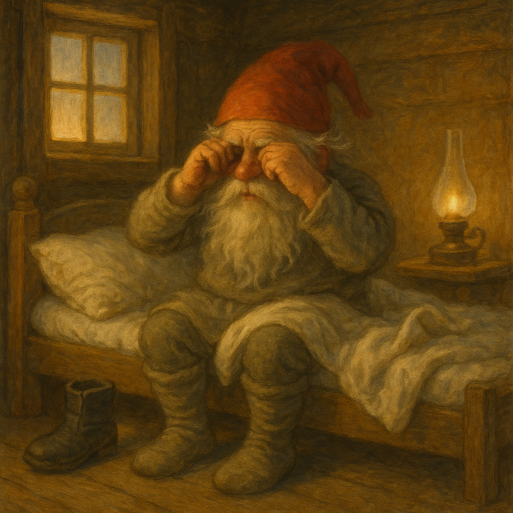 Inne i den største koia våknet nissene sakte til liv. Glørne i ildstedet glødet stille, og i en krok lå rampenissen under bordet med beina i en vedkurv etter nattens rampestreker. Nissebarna sov med nesene stikkende ut av skinnfeller, mens de eldre nissene snudde på seg og mumlet noe om at adventsmorgener alltid kom for tidlig.