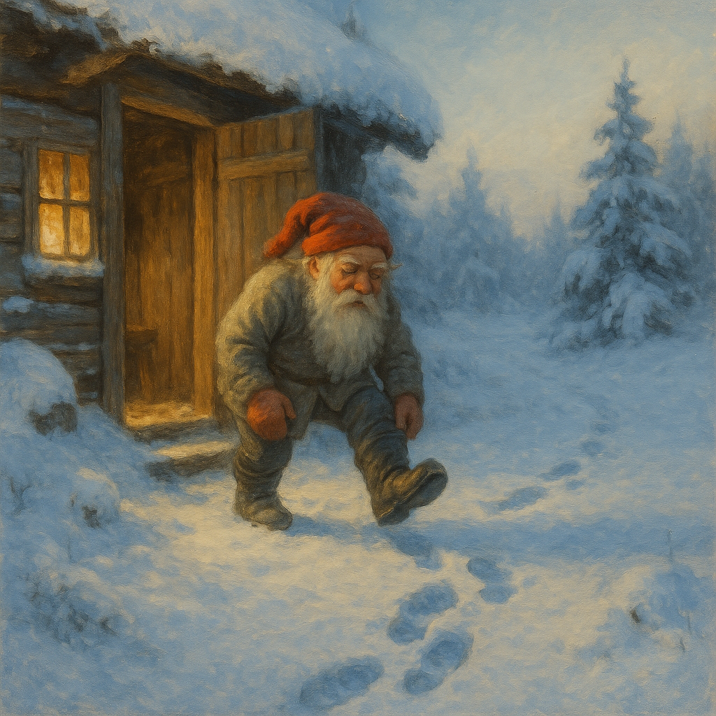Nissefar drar støvlene på med et tungt sukk, fortsatt mer i drømmen enn i dagen. Han rusler søvnig ut av hytta, og døra knirker lavt i det han lukker den bak seg. Den klare vinterlufta møter ham som et kaldt puff i ansiktet, og snøen knitrer under hvert steg.