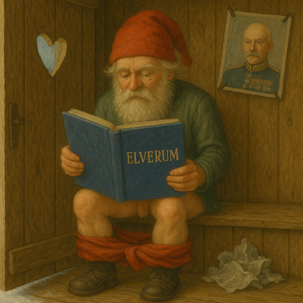 Nissefar sitter på utedoen og nyter et av døgnets aller viktigste øyeblikk – alenetiden. Snøen ligger stille rundt den lille bua, men inni er det varmt nok til at han kan lene seg tilbake og bla rolig i boka om Elverum.