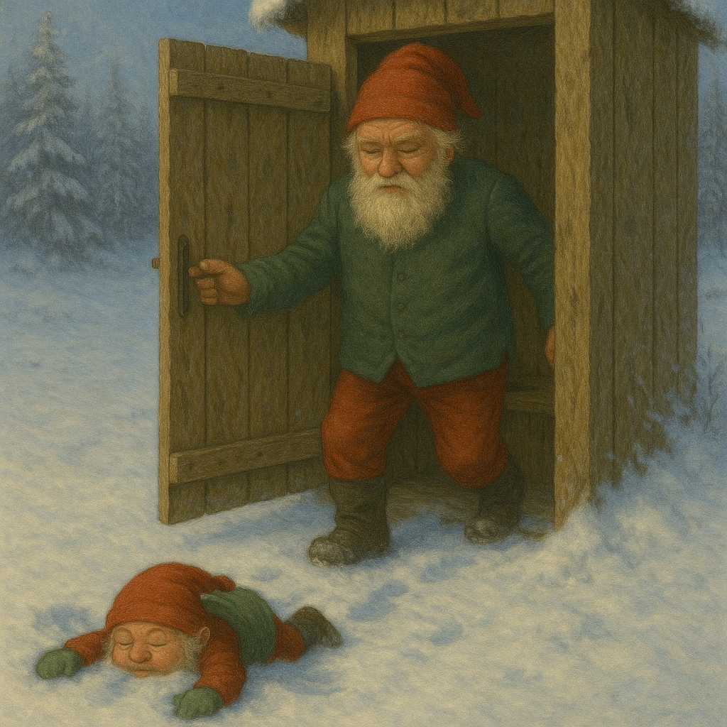 Med skjegget på snei og et halvt blunk i øyekroken vandrer han mot utedoen – like morgengretten som en nisse kan være, men trofast mot dagens første gjøremål.