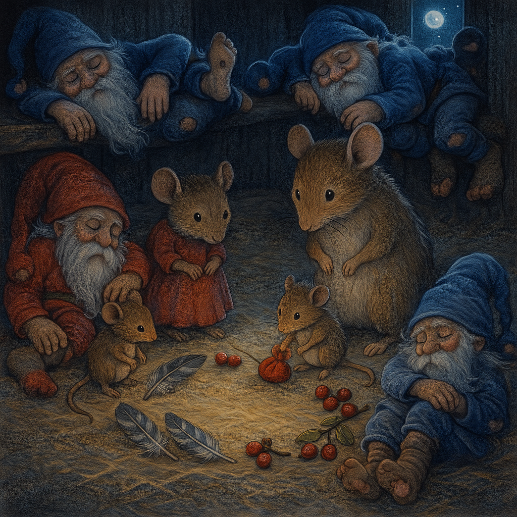 I nattens stille timer hadde musefamilien jobbet iherdig i skjul. Med små, raske poter hadde de klippet, bundet, trillet og pakket sammen små gaver av alt skogen kunne by på: kvister, nøtter, barnåler og tørkede bær.