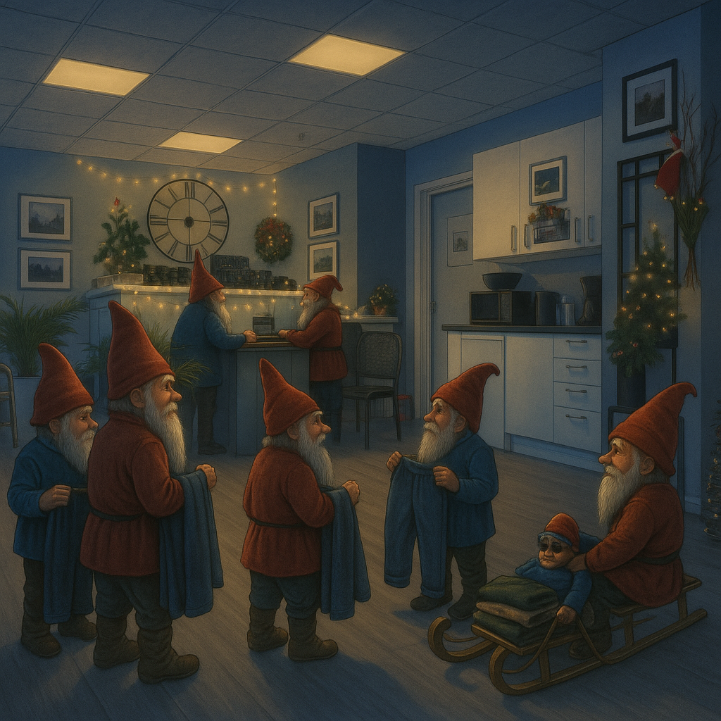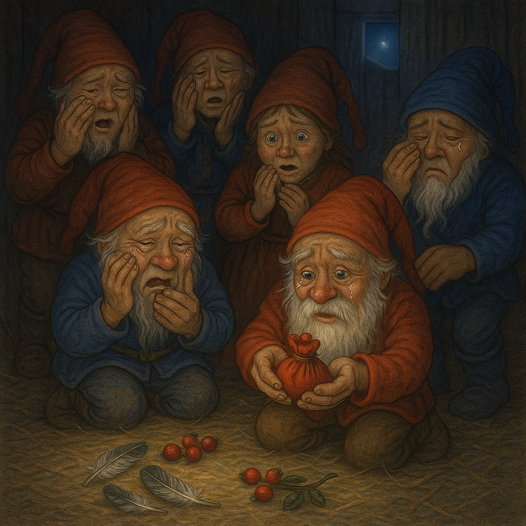 Gamle nissefar bøyde seg sakte ned, strøk skjegget bakover og kjente en tåre presse seg frem i øyekroken. De andre nissene sto tett rundt ham, rørt på samme vis – så små gaver, men så stor omtanke.