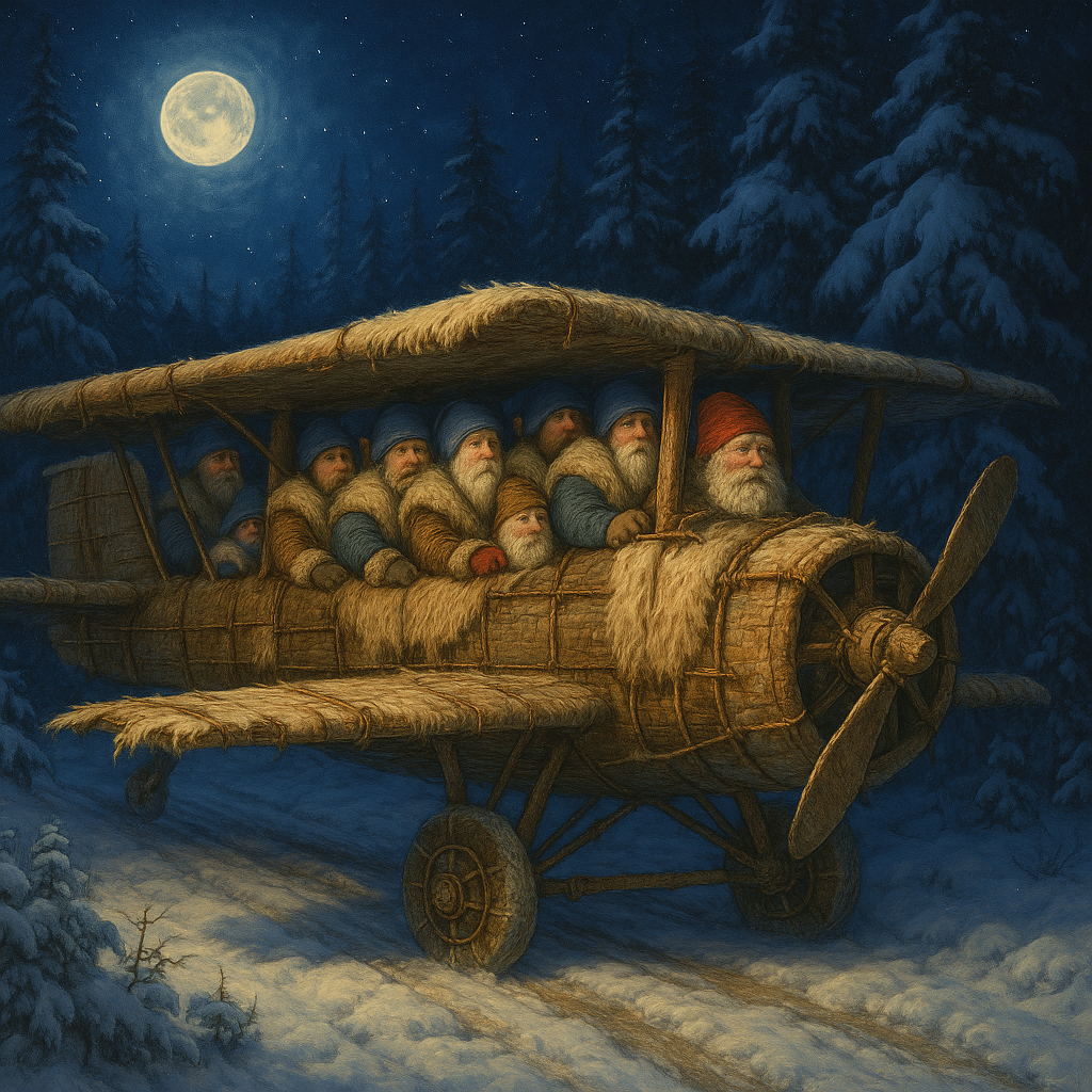Da motorlyden av knirkende bjørkegreiner og sildrende never tok til, satte nissene seg godt til rette i setene av gamle sekker og mose. Vinden rev i skjeggene deres idet flyene steg, vinglete og modige, mot himmelen.