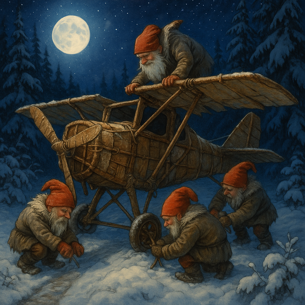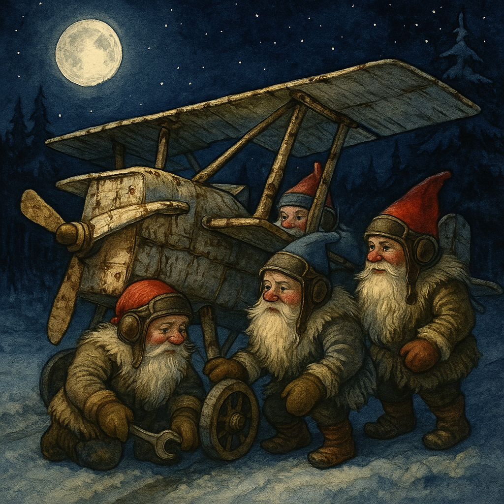 Nisseflyene sto klare på den snødekte sletta – en herlig skranglete konstruksjon av never, osp, bjørk og en gammel trillebårdel som fungerte som både flykropp og landingsbein. Det knirket i hver pinne og hvert neverlag når vinden strøk over dem, som om flyene småpratet seg imellom før avgang.
