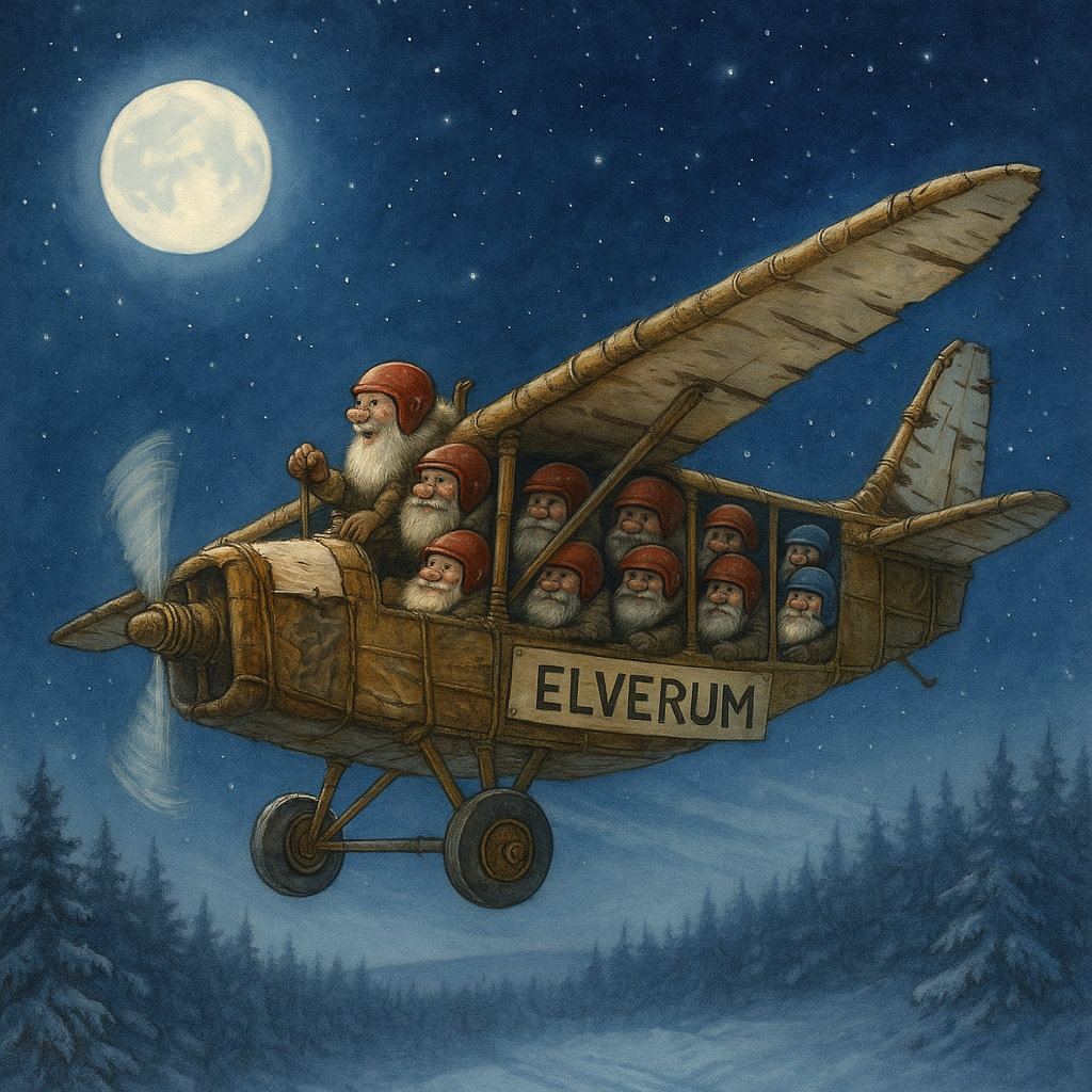 Fjøsnissene som hadde valgt å reise til Elverum med de hjemmelagde skogsflyene sine, kom inn for landing i ekte nissestil – hulter til bulter og uten særlig styring. Flyene, som skranglet som gamle vedkurver i vinden, dalte ned over byen med både mot og flaks som hovedmotorer.