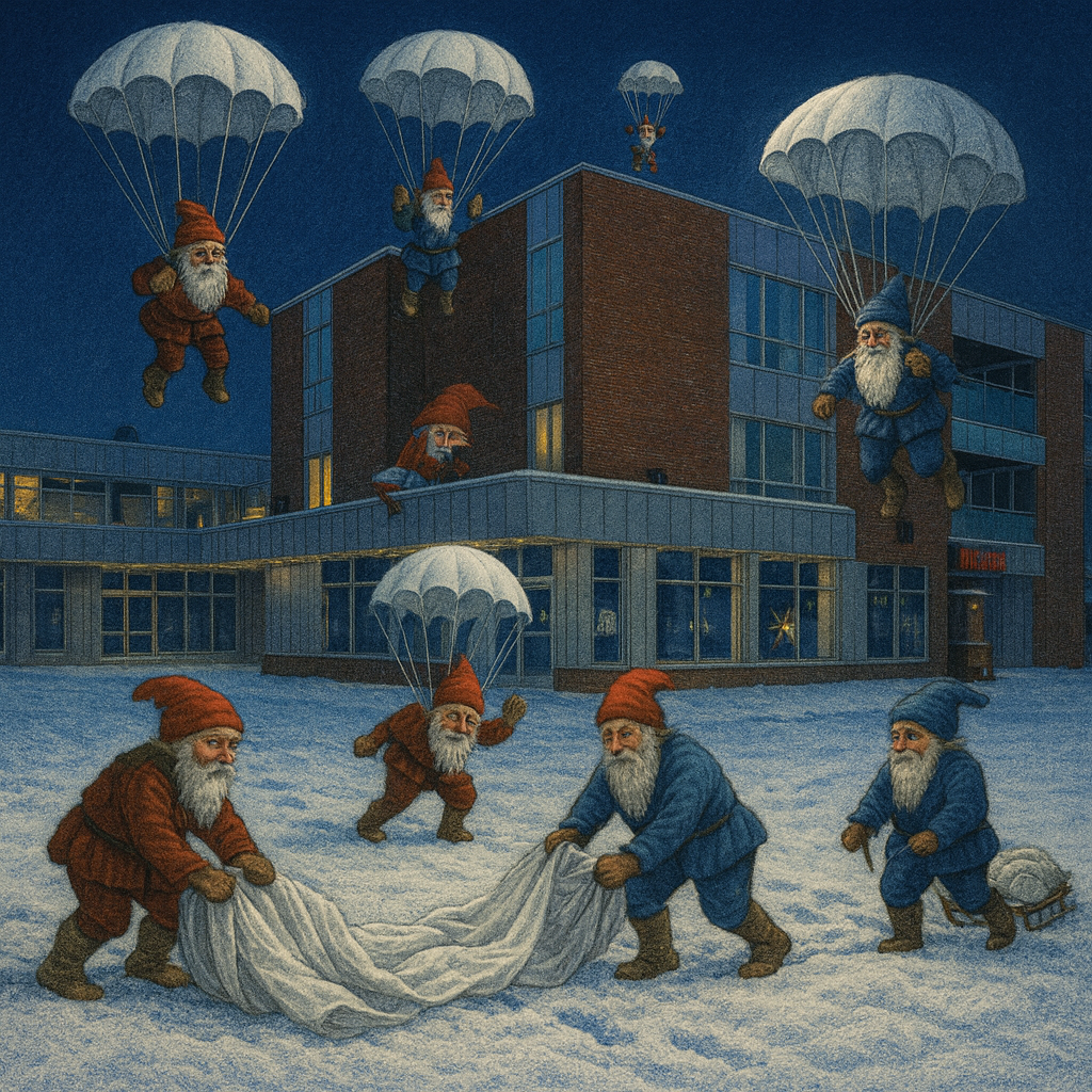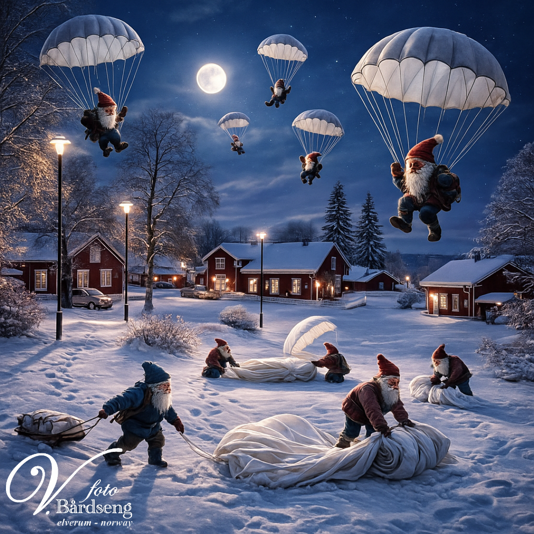 Til slutt kastet de seg ut i fallskjerm, og nissene dalte ned mot Elverum som dansende snøfnugg. De landet i Triangelparken, ved Østo og nesten på taket til Amalfi. En blånisse landet i en snøhaug og måtte graves ut.