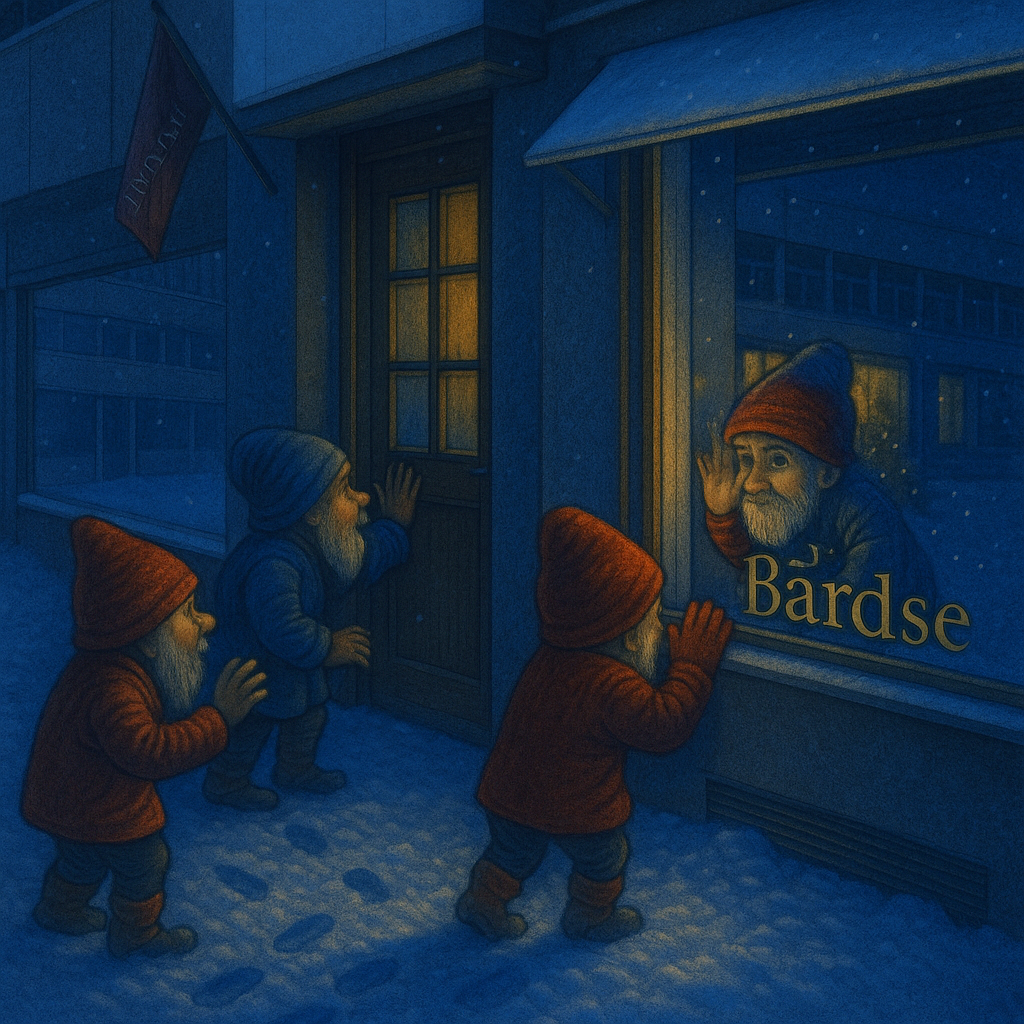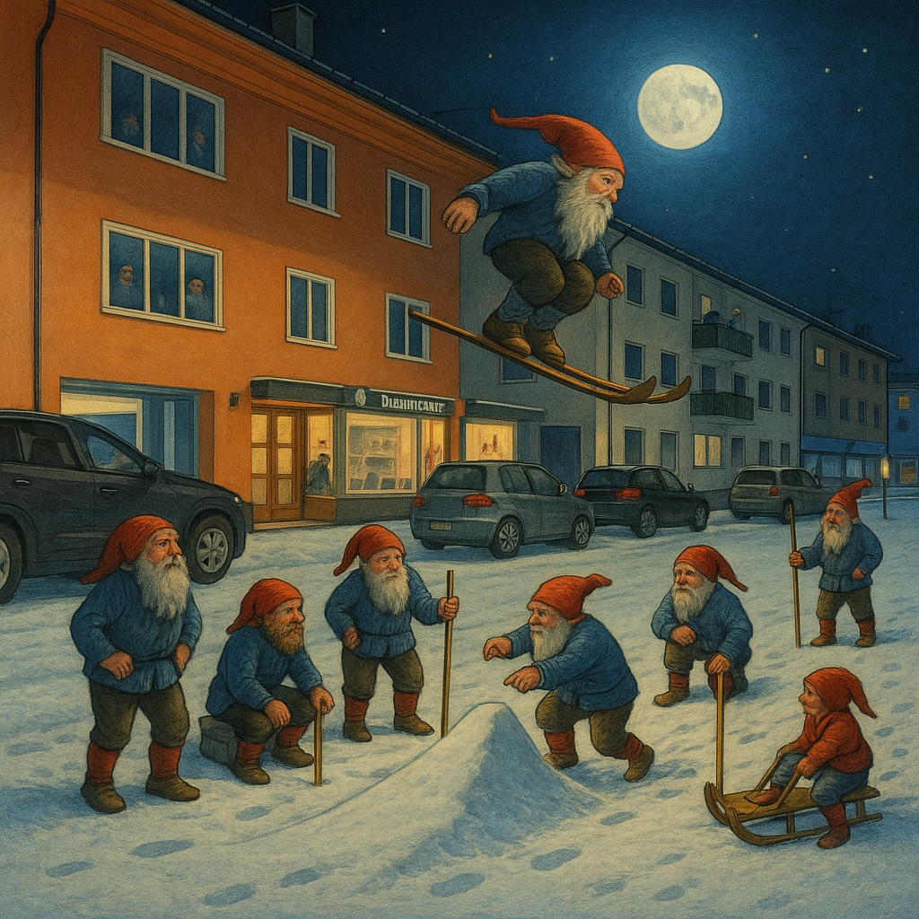 Nissene lusket utenfor vinduene til Viggos butikk, skjult av snødunger og måneskygger. De presset små neser og skjeggete kinn mot glasset for å få et glimt av innsiden. Hver eneste en studerte nøye hyllene, døra, og den gamle låsen som hang nederst – som om de planla et stort, men høyst godhjertet, innbrudd.