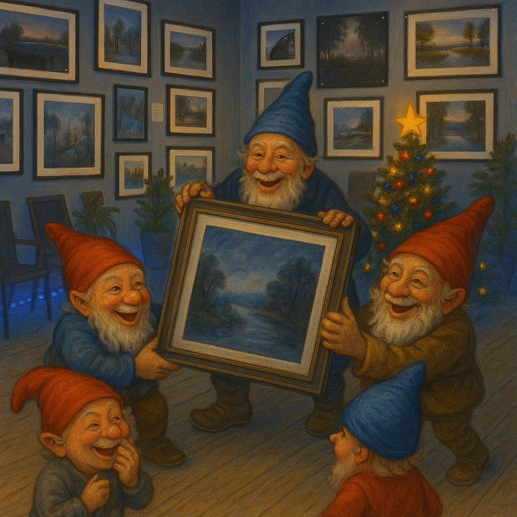 Og selvfølgelig begynte praten raskt å gå om hvilke bilder de kunne ta med som gaver. Ikke stjele, nei da – nisser tenker jo alltid godhjertet – men å plukke med seg noen små kunstskatter til venner og familie i skogen.