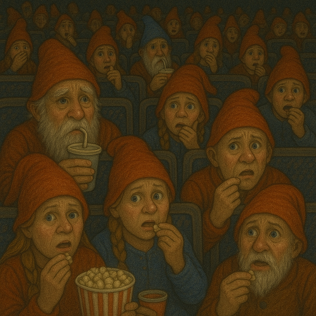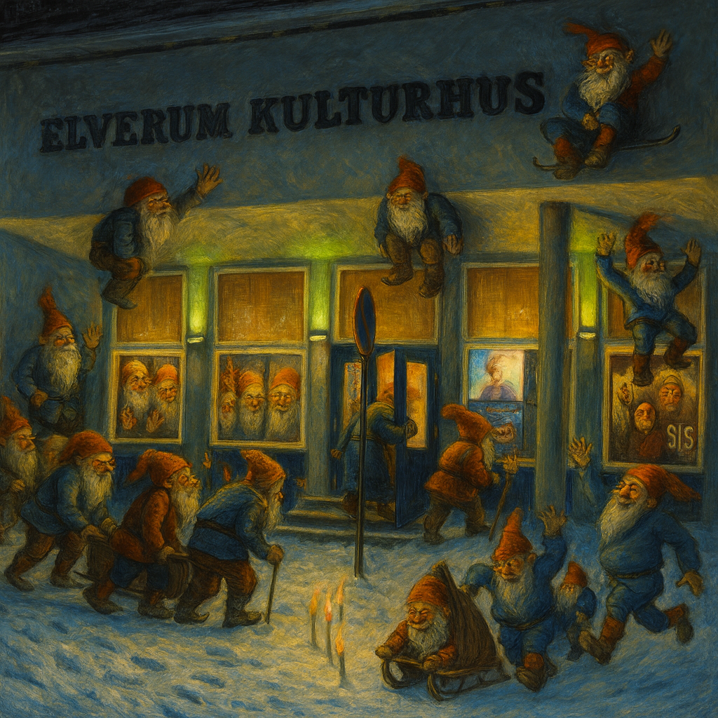 Elverum lå mørkeblå og stille under vinterhimlen. Snøen i Triangelparken glitret, og rampenissene var allerede i gang med å lage en hoppbakke i skråningen ved Kulturhuset. Kinoen lå tom, men nissene satte seg i stolene og lot det store lerretet fylle dem med undring.