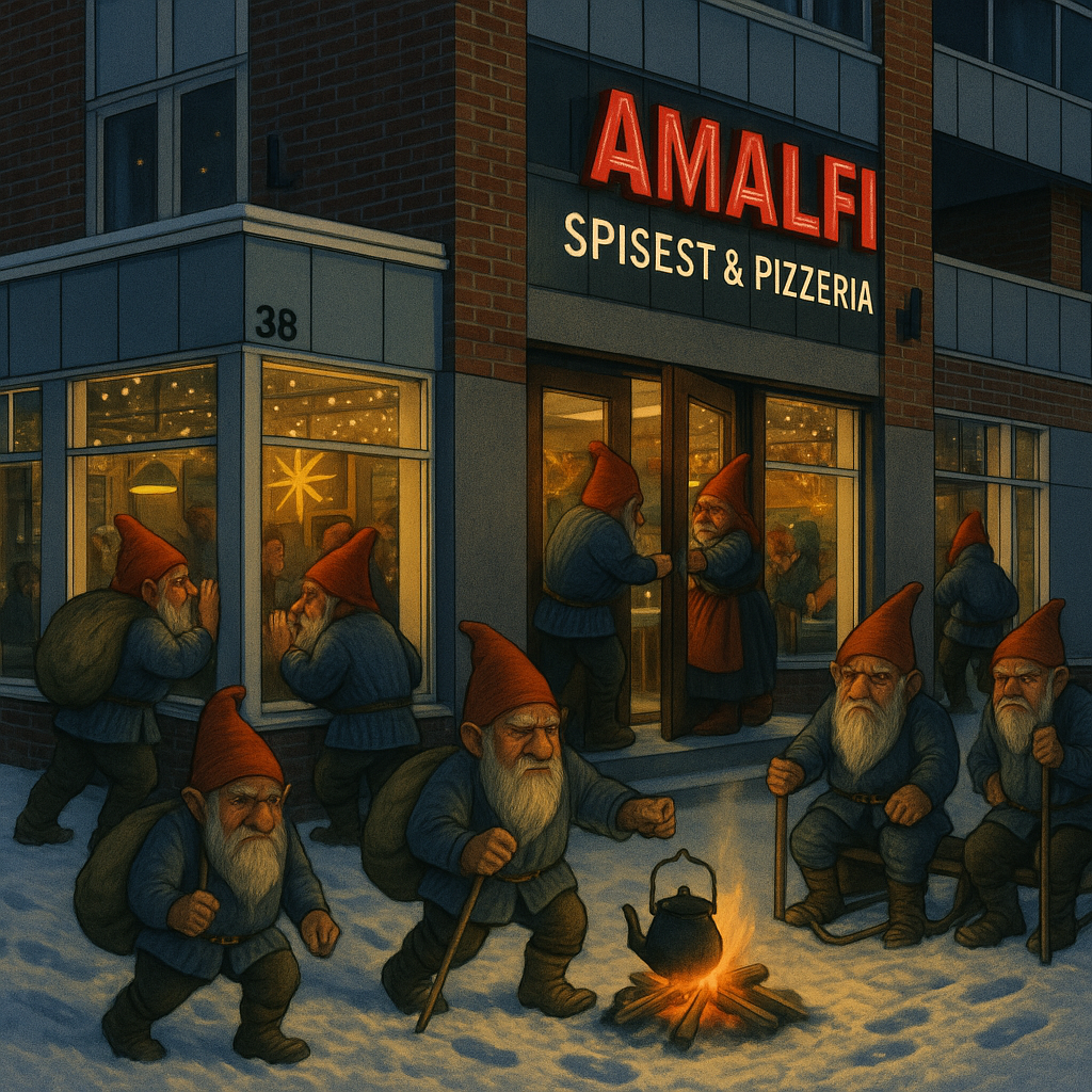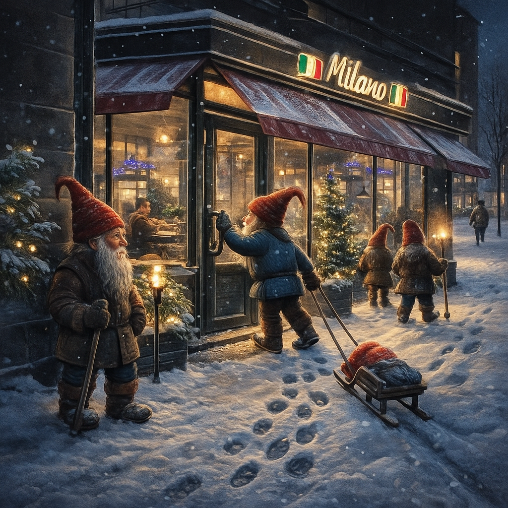 Da de tittet rundt i vinterkvelden, lyste to steder varmt mot dem: Milano og Amalfi. Vinduer fulle av varme farger og duftene som snek seg ut i den klare luften, gjorde at nissene stoppet opp og stirret med store øyne. Her var det mat de aldri hadde smakt før – dufter av krydder, stekte retter, pizzaer som snurret i lufta, og pastagryter som putret i kjøkkenet. Det var som å se inn i en helt ny verden. Men, turte de å gå inn ?