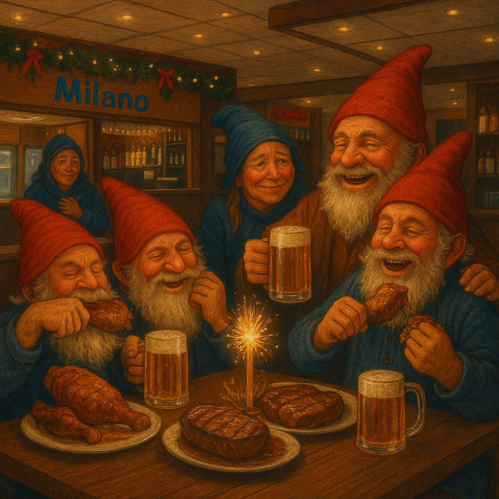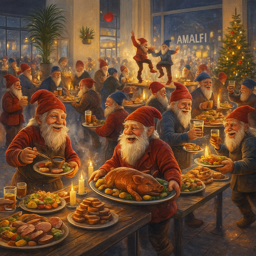 Valget ble umulig å ta – så de tok like godt begge. Først et måltid på Milano, der nissene nesten datt av stolene da de smakte pizza med sprø bunn og ost som smeltet på tungen. Deretter bar det videre til Amalfi, hvor de oppdaget at pasta kunne være like magisk som et nysnøfall.