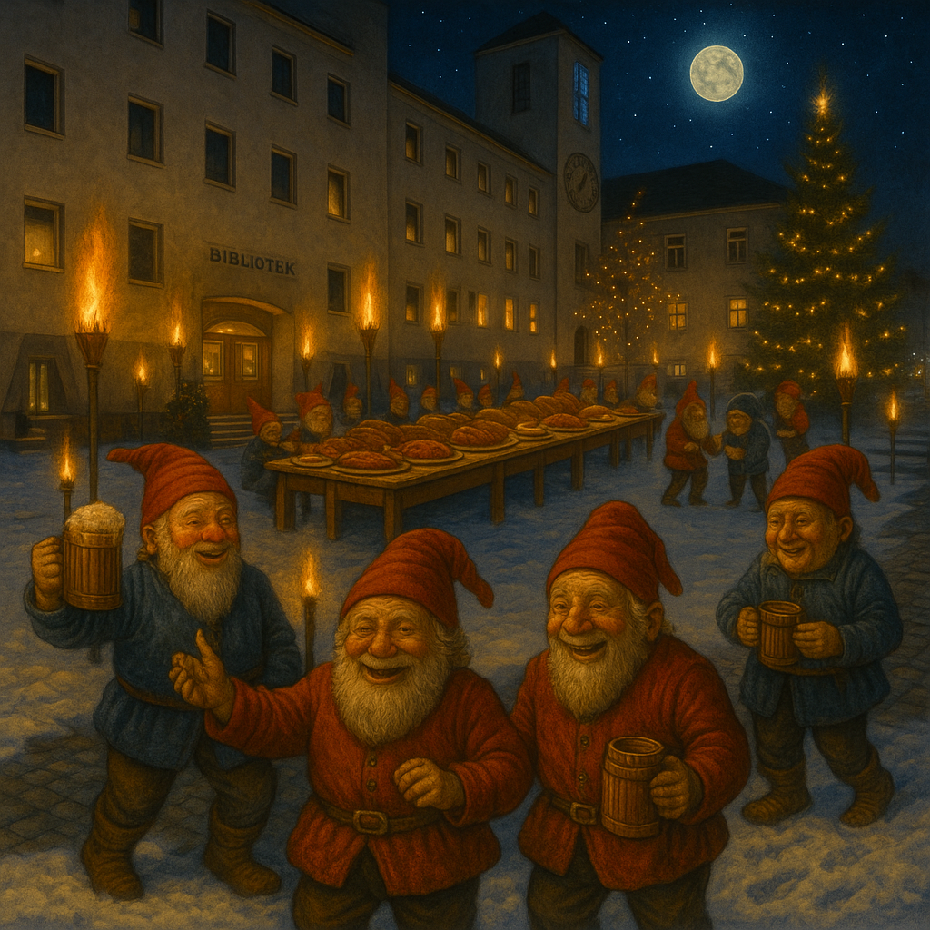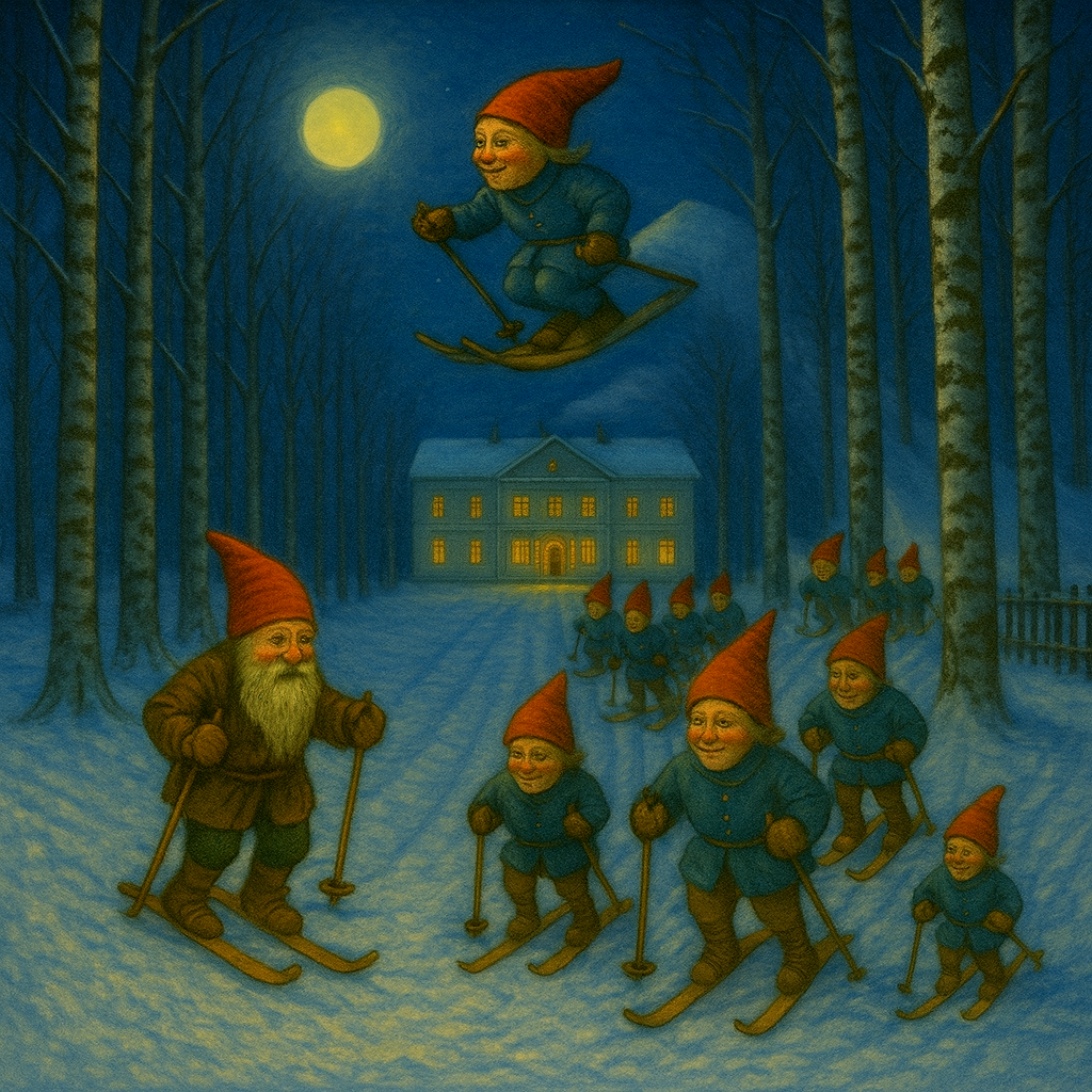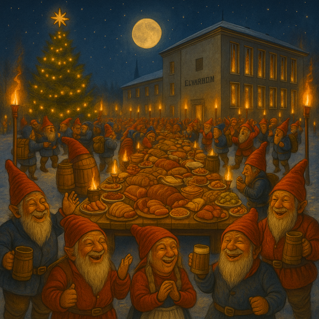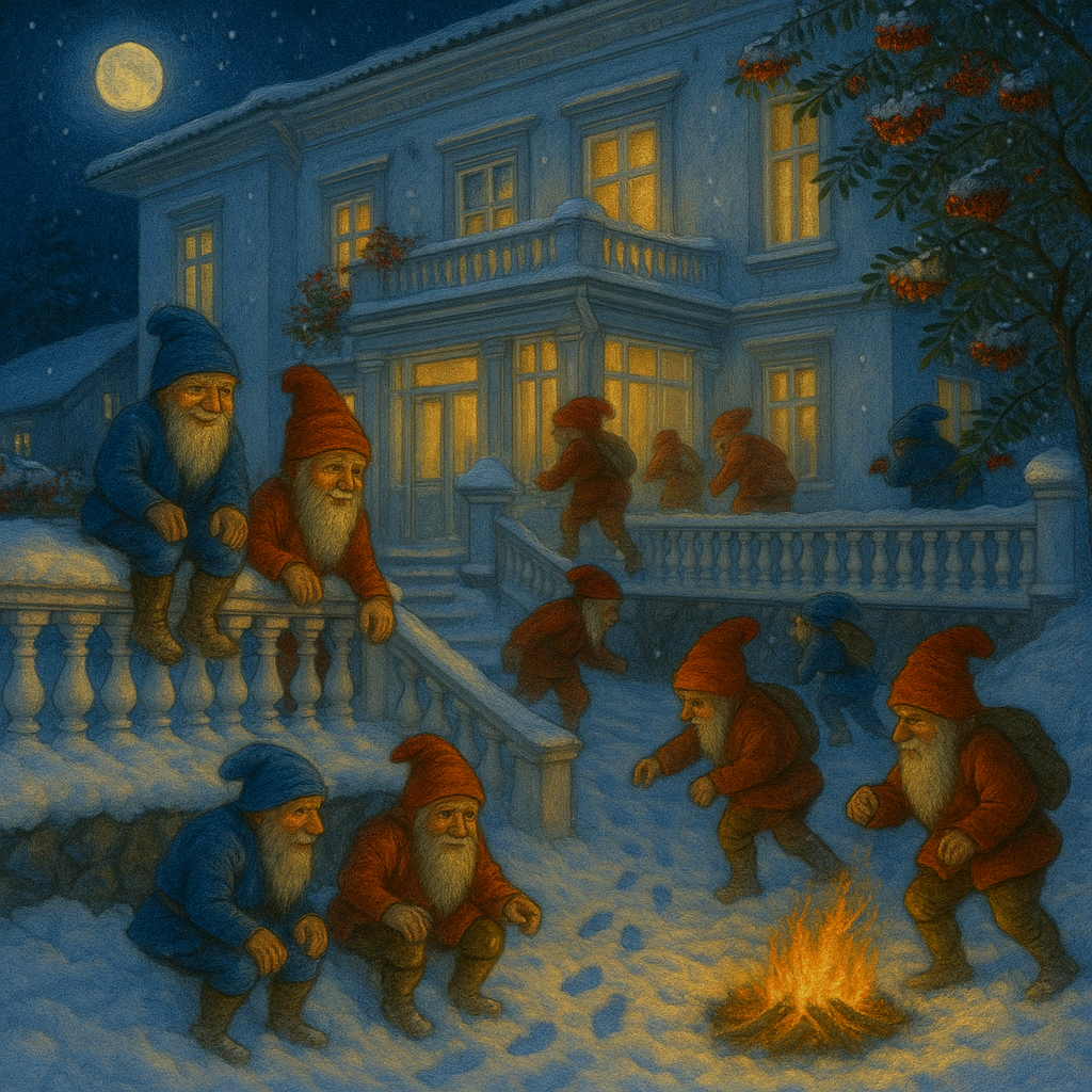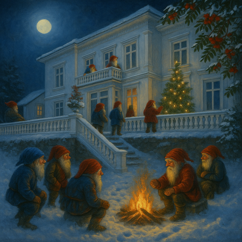 Når de ankom denne natten, ble det straks roligere i flokken. Noen tente en bitteliten gløgggryte bak vedskjulet, andre tegnet mønstre i rimlaget på veggen. En blånisse spilte lavt på en barkfløyte, mens en gammel rødnisse danset en sakte, rund dans i snøen.