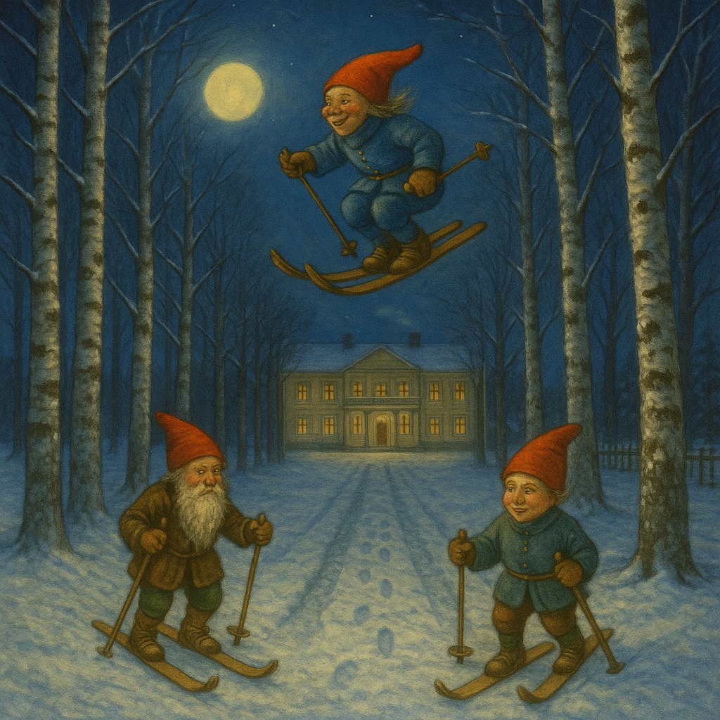 Gamlenissen ble sittende så lenge at tiden nesten forsvant mellom sidene i boka. Ute knaste snøen svakt, og før han visste ordet av det, hørte han små, raske tråkk nærme seg. Lille-Skråsjegg – den minste, mest rastløse av hele nisseslekta – kom tassende gjennom morgenlyset.